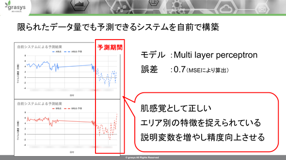 期待を一身に受けたgrasysは、ニューラルネットワークの一種を採用して予測システムを自前で構築した。限られたデータから精度と現実性のバランスを取った予測モデルを設計することを得意とする同社が、「どのモデルを使うか」「どのような設定をモデルに適用するか」「どの期間のデータを使うか」という3つの要素を最適化し、予測の誤差を許容範囲内に収めることに成功した。